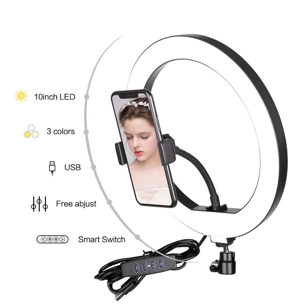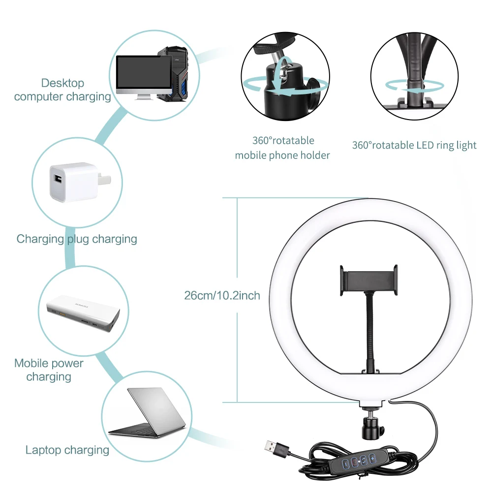 Color: white/warm/natural Input power: 110V-240V 50HZ/60 Out power: 55W LM: 3000LM Adjustment range : Stepless adjustment Color temperature: 3200K-5600K(±200K) CRI: RA>90 Dimension: 26cm Universal Phone Holder:(2.36"to 3.35" in width)