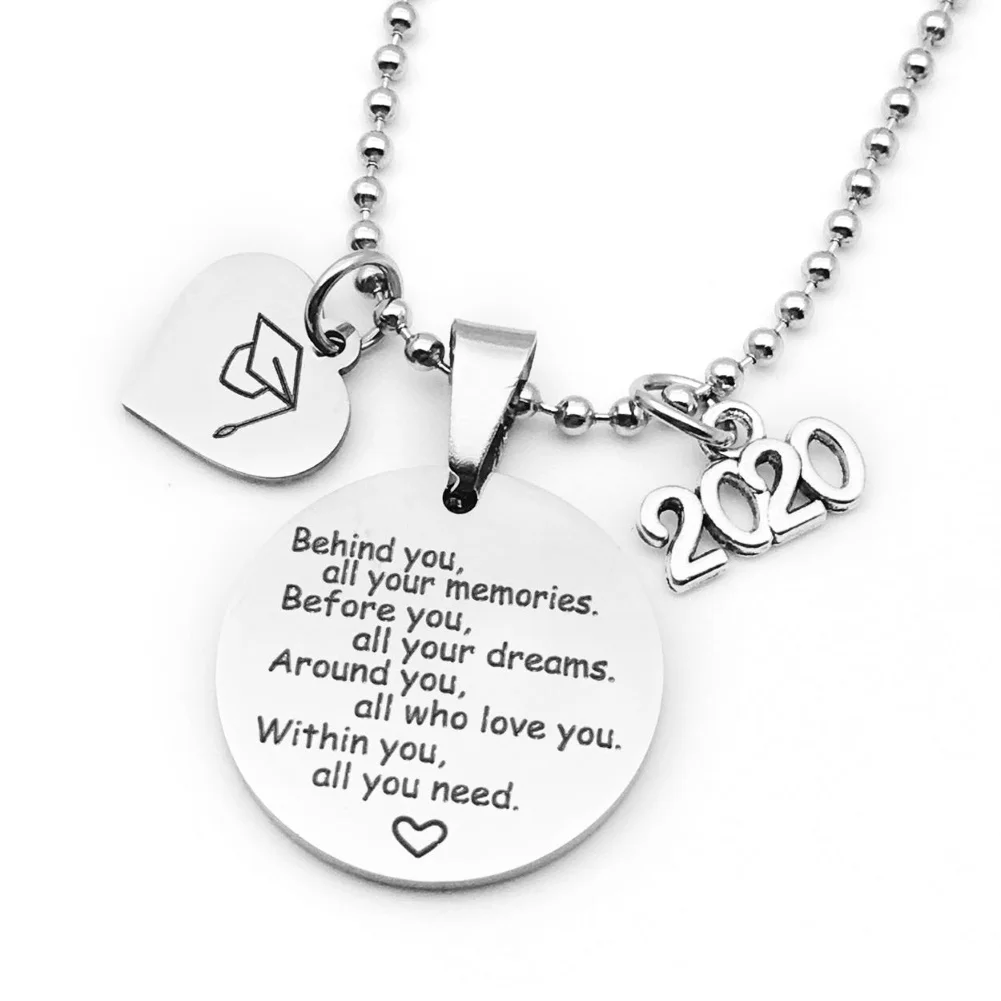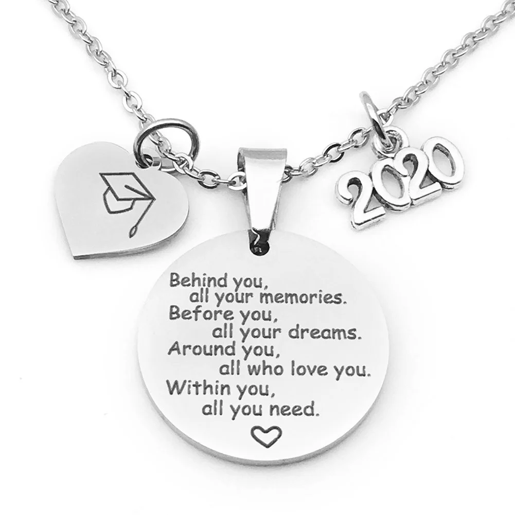 Ожерелье с шармом в виде сердца с колпачком для выпускного, шармом 2020 и круглой подвеской с гравировкой на английском языке