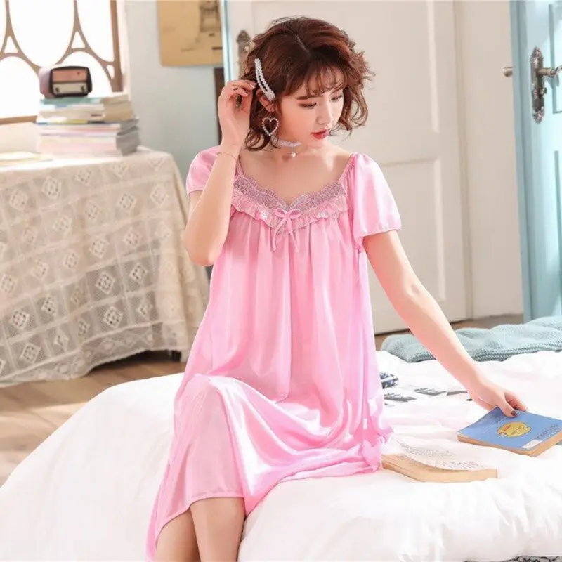 Женская ночная рубашка из искусственного шелка, свободная Однотонная ночная рубашка с коротким рукавом и оборками, кружевная Пижама с бантом, большие размеры