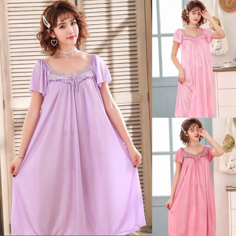 Женская свободная Ночная рубашка большого размера из искусственного шелка с коротким рукавом и оборками, Однотонная ночная рубашка с бантом, кружевная одежда для сна для мамы