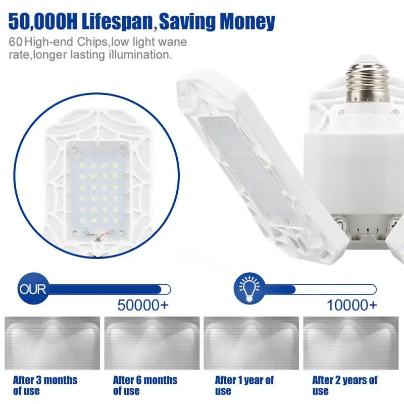 -Прочный срок службы-40/60W СИД гаражное Светильник лампы приходят со средними E26/e27 база, изготовлен из безопасных Премиум Корпус из АБС-пластика и ПК, Стабильная и надежная с целью обеспечения максимальной производительности, более 50000 часов, высокая экономия энергии, тот же светильник ing эффект более чем на 80% экономии энергии, чем традиционные лампы. Такие как замена 175w cl led, 320W Металлические лампы Hailde, 100w лампочка hps и лампы накаливания.
