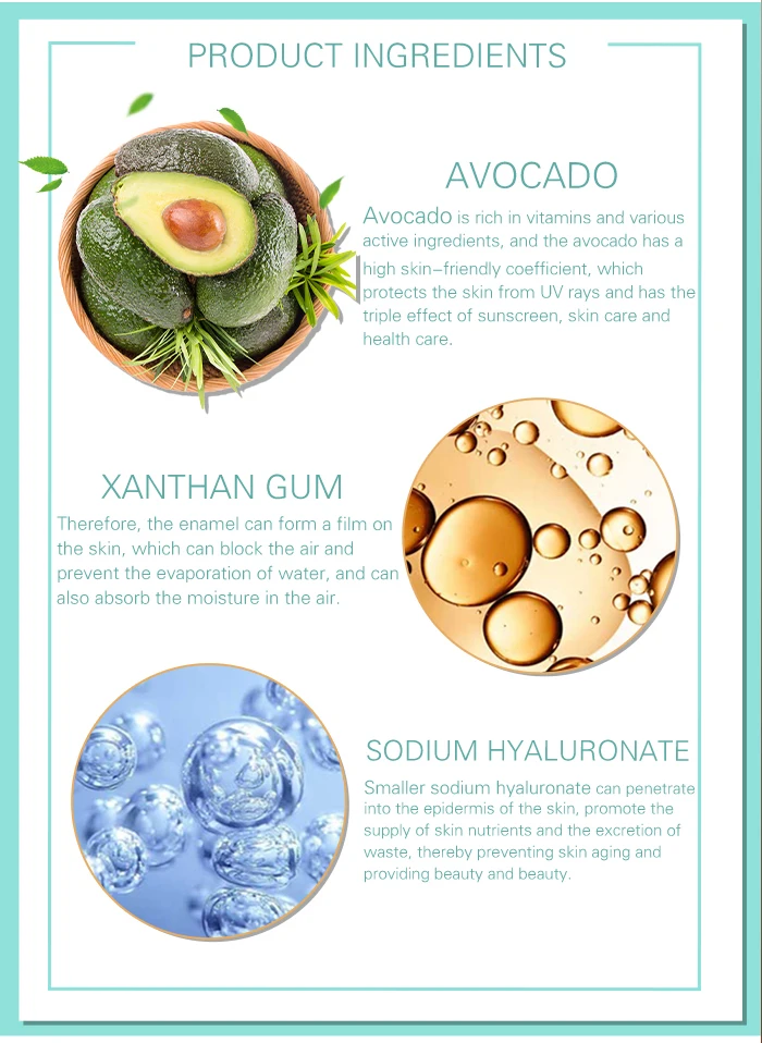 Увлажняющий авокадо, увлажняющий с гиалуроновой кислотой, питательная и питательная кожа, снимает сухость и шероховатость, придает коже мягкость и гладкость, оставляя кожу белой, гладкой и гладкой.