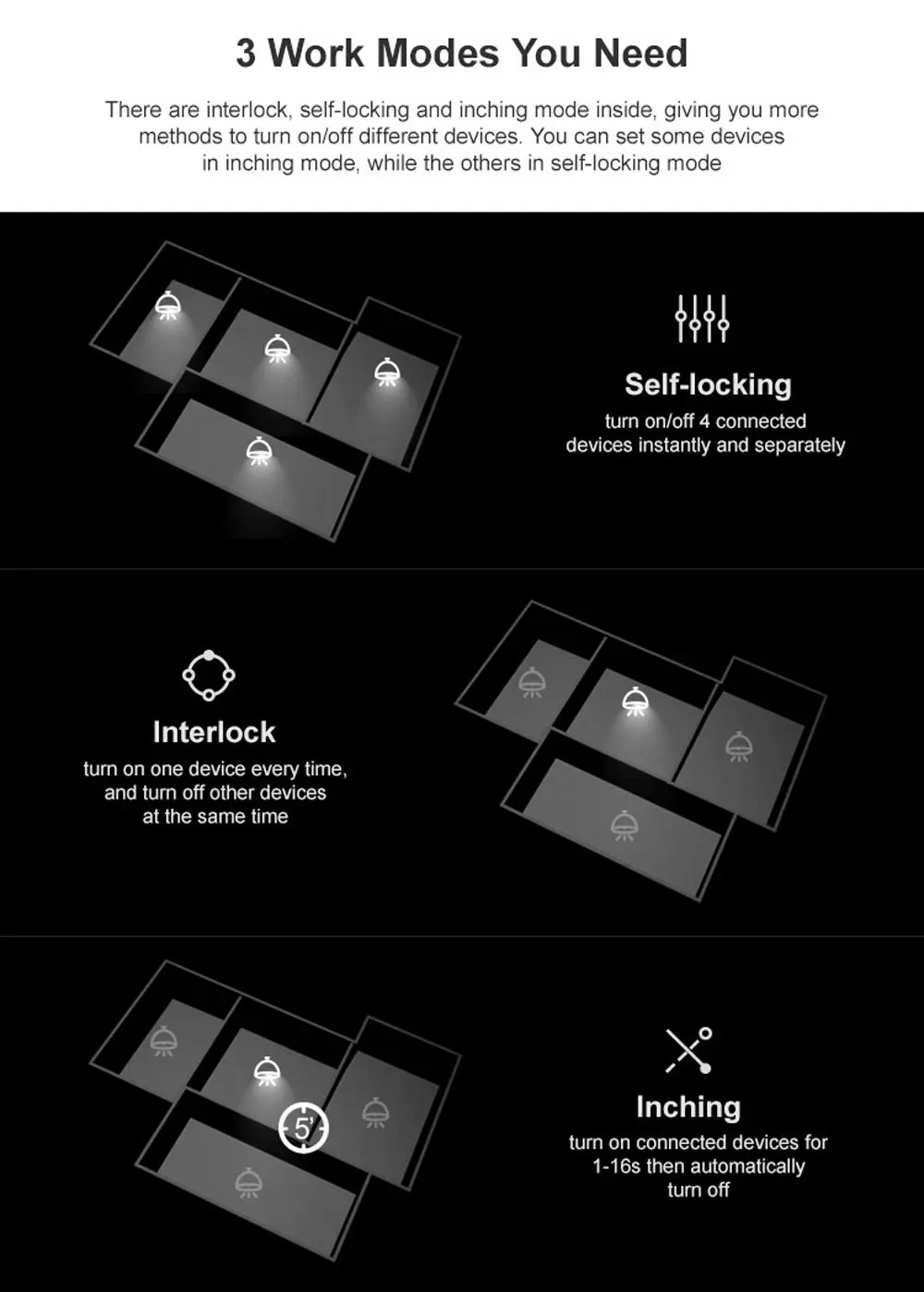 Внутри есть автономный блокирующий и инширующий режим, предоставляющий вам больше способов включения/выключения различных устройств. Вы можете установить некоторые устройства в режиме инчинга, в то время как другие в режиме самоблокировки.
