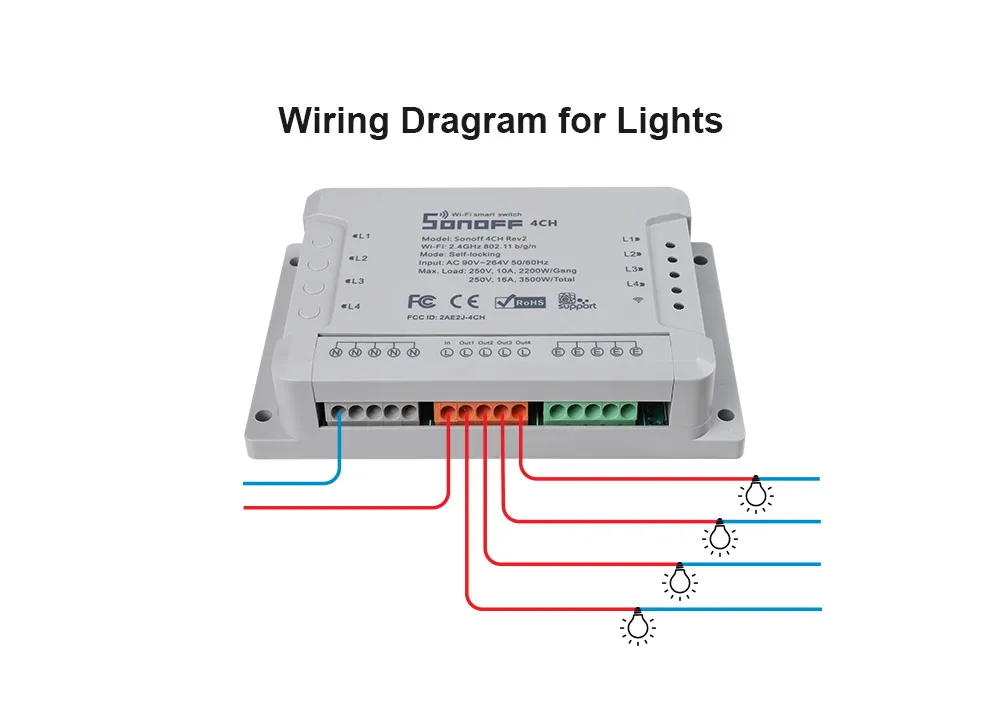 Sonoff 4CH R2 4-gang switch с din-рейкой. Светильник Sonoff 4CH R2 4 gang поддерживает подключение и управление 4 электрическими приборами, которые можно включать/выключать отдельно кнопками или iOS/Android App EweLink. Кроме того, с помощью переключателя multi gang вы можете проверить состояние устройств в реальном времени для каждого устройства в приложении. Владение Sonoff 4CH R2 multi банды выключатель означает, что вы имеете 4 Sonoff basic переключатели WiFi интеграции вместе. 4CH Pro R2 4 переключатели WiFi. Они поддерживают переключение между 3 режимами работы: блокировка/самоблокировка/инширование, и оба поддерживают установку задержки 1-16 с в режиме инширования. Эта функция позволяет включить переключатель в течение нескольких секунд, затем выключить, который работает как импульсный переключатель. Они интегрируются с модулем радиочастотного приемника 433,92 МГц, что позволяет управлять им с помощью радиочастотного пульта. Умные переключатели установлены на din-рейке.