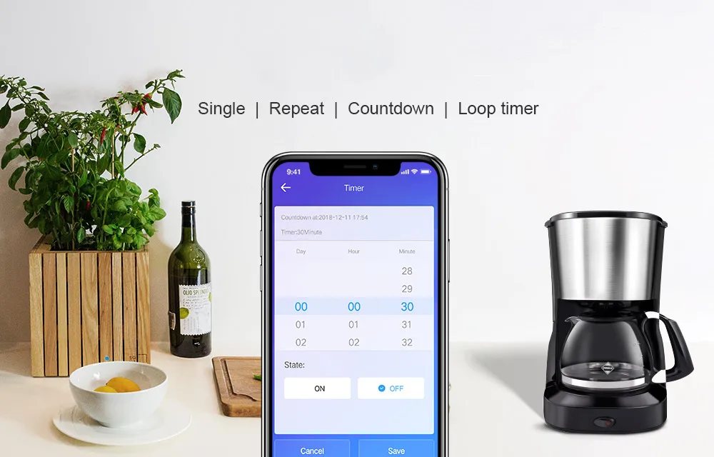 Вы можете установить ежедневный, еженедельный или месячный срок для приборов, и выключатель автоматически включит или выключит их в определенное время.