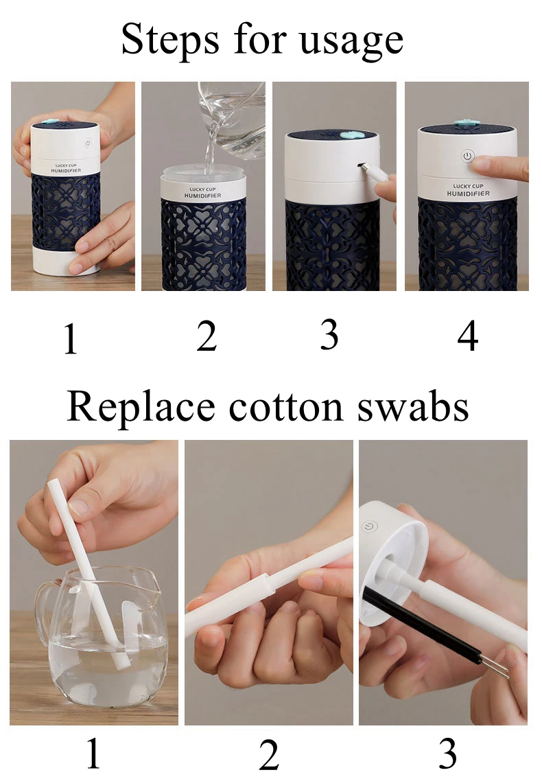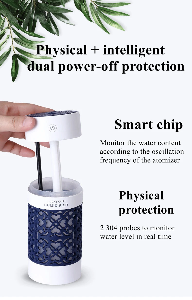 Название продукта: Счастливый увлажнитель Номеров продукта: SQT-J02 Материал: АБС + ПП + силикон + электронные компоненты Рабочий ток: 500MA Входное напряжение: DC5V Потребляемая мощность: 2 Вт Объем распыления: 35 мл/ч Емкость бутылки для воды: 250 мл Время использования: 1-я передача 4 часа, 2-я передача 8 часов Размер продукта: 70*70*149 мм Вес нетто: 165 г/175 г Цвет: розовый/синий/королевский синий/бежевый