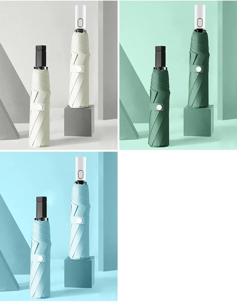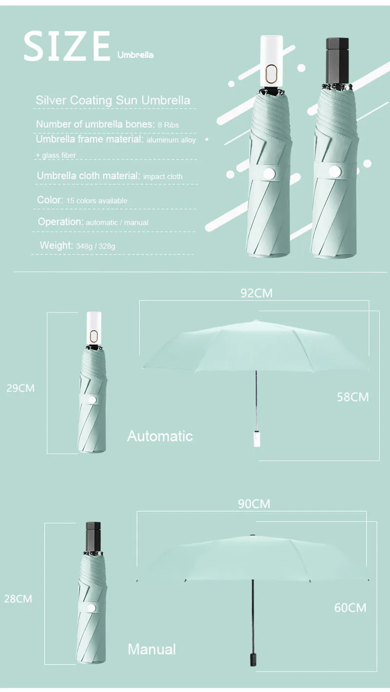 Покрытые серебром зонтик от солнца Количество зонтичных костей: 8 ребер Материал рамы зонта: алюминиевый сплав + стекловолокно Материал зонта: ударная ткань Цвет: Доступно 15 цветов Управление: Автоматическое/ручное Вес: 348 г/328 г