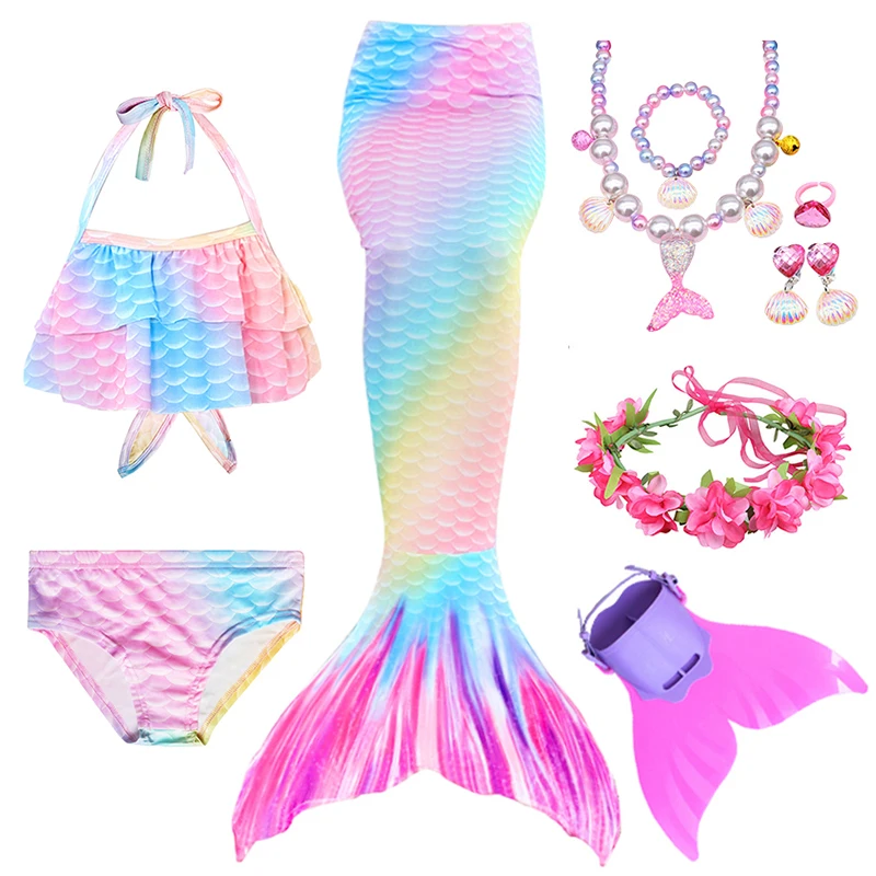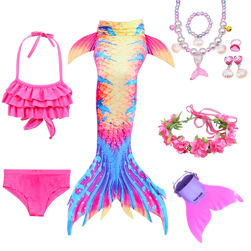 10 шт.: 1 * платье с хвостом русалки + 1 * бюстгальтер + 1 * шорты + 1 * гирлянда + 1 * ластик монофин + 1 * ожерелье + 1 * браслет + 1 * кольцо + 1 пара зажимов для ушей