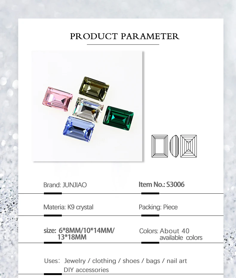 10*14 мм заостренная задняя сторона Необычные прямоугольные стразы s кристаллы и стеклянные стразы для дизайна ногтей для одежды рукоделие ногти Продукт: хрустальный камень Материал: Кристалл K9 Размер: 10*14 мм/6*8 мм/13*18 мм Цвета: выберите в соответствии с цветом на картинке Применение: ювелирные изделия, ожерелье, кольцо, одежда, обувь, сумки, Нейл-арт, украшения, аксессуары DIY... Информация о продукте: Номер товара: S3006