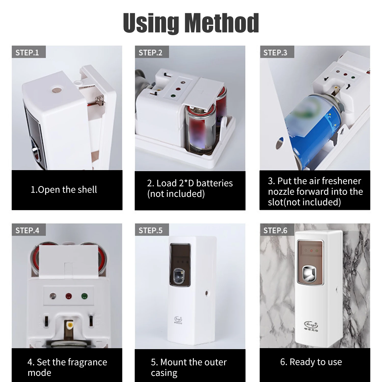 Автоматический диспенсер для освежителя воздуха поможет сохранить свежесть запаха вашей ванной комнаты с непрерывным ароматом. Большая емкость Подходит для банок 200 мл или 230 мл. Автоматически выводит ароматный воздух таймером и показывает более высокую производительность.