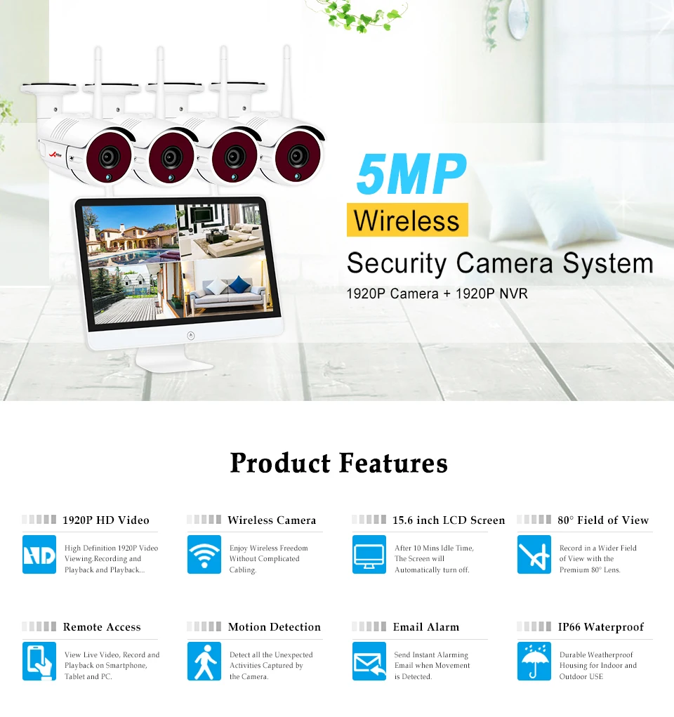 Эта беспроводная система безопасности с 15,6 дюймовым монитором, вы получите изображения 5 Мп после завершения установки и сэкономиете много денег, чтобы купить дополнительный монитор ПК/ТВ для подключения.