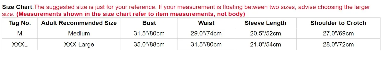 Размер на бирке. Взрослый рекомендуется Размеры Обхват груди Обхват талии Рукав Длина Длина от плеча до паха М Средний размер 31,5 "/80 см 29,0 "/74 см 20,5 "/52 см 27,0 "/69 см XХХL ХХХ-большой 35,0 "/88 см 31,5 "/80 см 21,0 "/54 см 28,0 "/72 смПолезные советы: Замеры делаются вручную, поэтому учитывайте небольшие погрешности. Цвет на фото может немного отличаться от реального товара из-за особенностей цветопередачи различных мониторов.