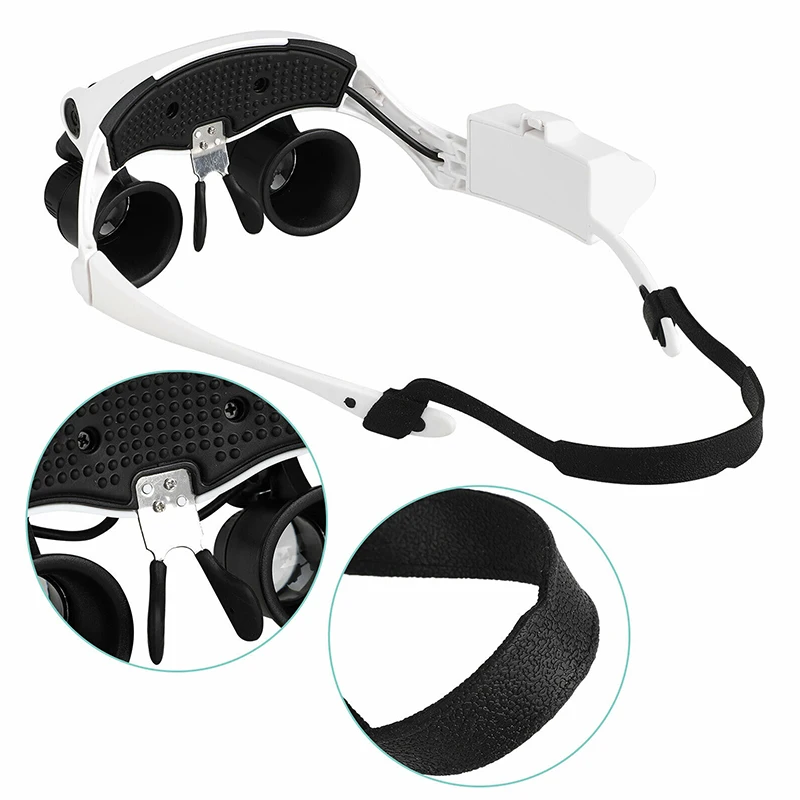 Эта головная Лупа с дизайном регулировки угла 150 градусов довольно проста в использовании разными людьми, особенно старыми. Просто носите его, как обычные очки. Есть 4 пара сменных линз 10X, 15X, 20X и 25X соответственно, так что различные требования к увеличению могут быть удовлетворены. Кроме того, светильник с 2 светодиодами может обеспечивать высокую яркость освещения в ночное время, что позволяет легко читать в ночное время или закрывать просмотр предметов. Подходит для ремонта часов, идентификации ювелирных изделий и так далее.