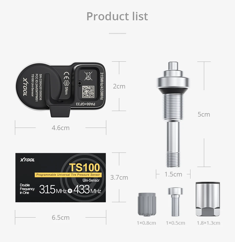 TS100-универсальный программируемый датчик давления в шинах, разработанный компанией Xtool. Он может заменить оригинальный датчик транспортных средств, оснащенных TPMS. Около 99% моделей на общем рынке подходят. Он интегрирует 315 МГц и 433 МГц две частоты. Он может быть активирован, может быть запрограммирован неограниченно, может быть подобран и может контролировать давление в шинах в режиме реального времени, идеально разработан для вашей безопасности вождения.