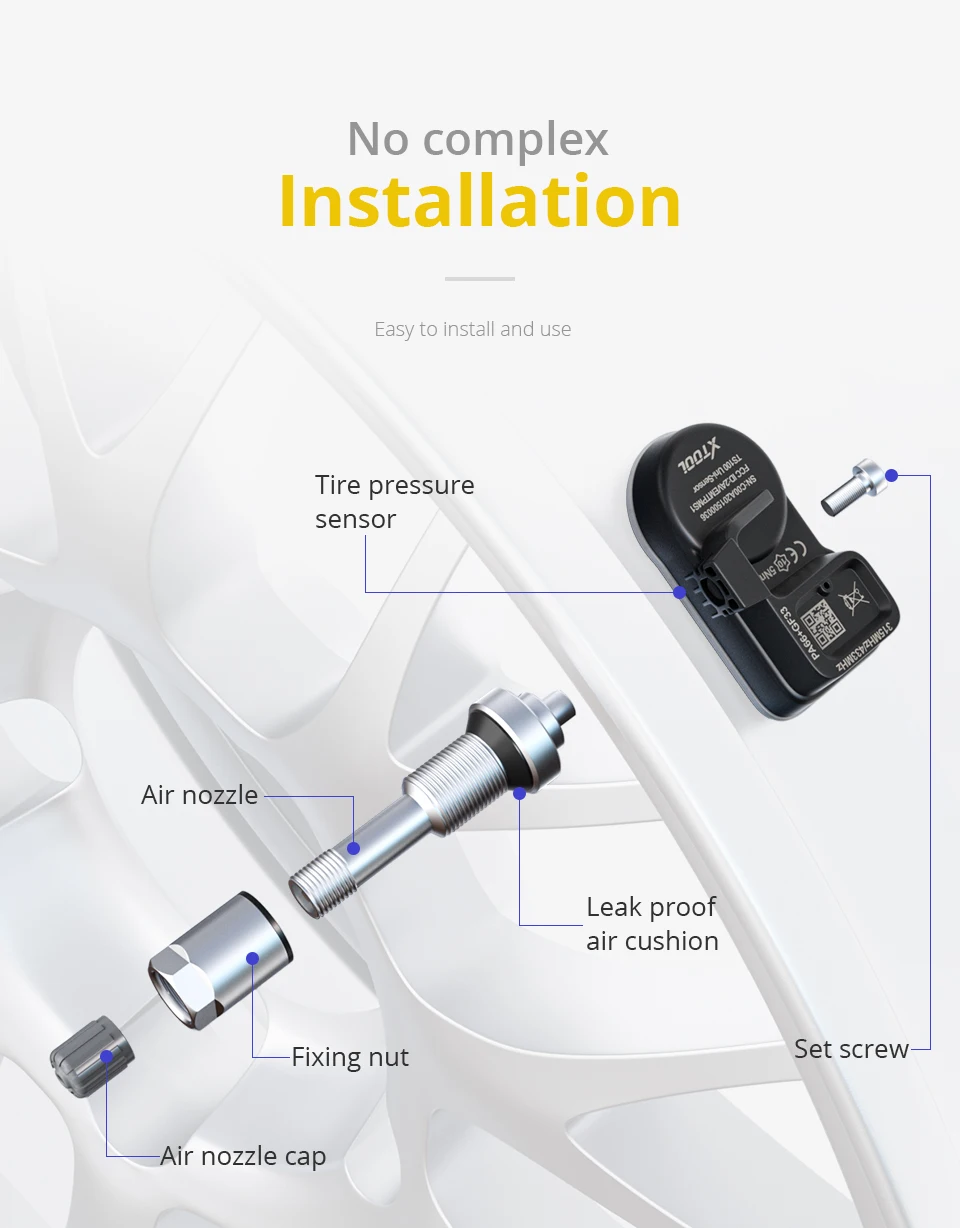 1. Сенсорные узлы TPMS являются запасными или ремонтными частями для транспортных средств, которые имеют заводскую систему TPMS. 2. Убедитесь, что запрограммируйте датчик с помощью инструментов программирования датчика XTOOL для вашего определенного автомобиля, модели и года до установки. 3. Не устанавливайте запрограммированный датчик TPMS на поврежденные колеса. 4. Чтобы гарантировать оптимальную функцию, датчик может быть установлен только с оригинальными вентилями и аксессуарами, предоставляемыми Autel. 5. После завершения установки, протестируйте Системы TPMS транспортного средства с помощью процедур, описанных в первоначальном руководстве пользователя производителя для подтверждения правильной установки. 6. Каждый раз, когда шина обслуживается или демонтируется, или если датчик удален или заменен, то обязательно заменить резиновую втулку, шайбу, гайка и сердечник клапана с нашими частями для обеспечения правильной герметизации. Обязательно заменять датчик, если он очень поврежден.