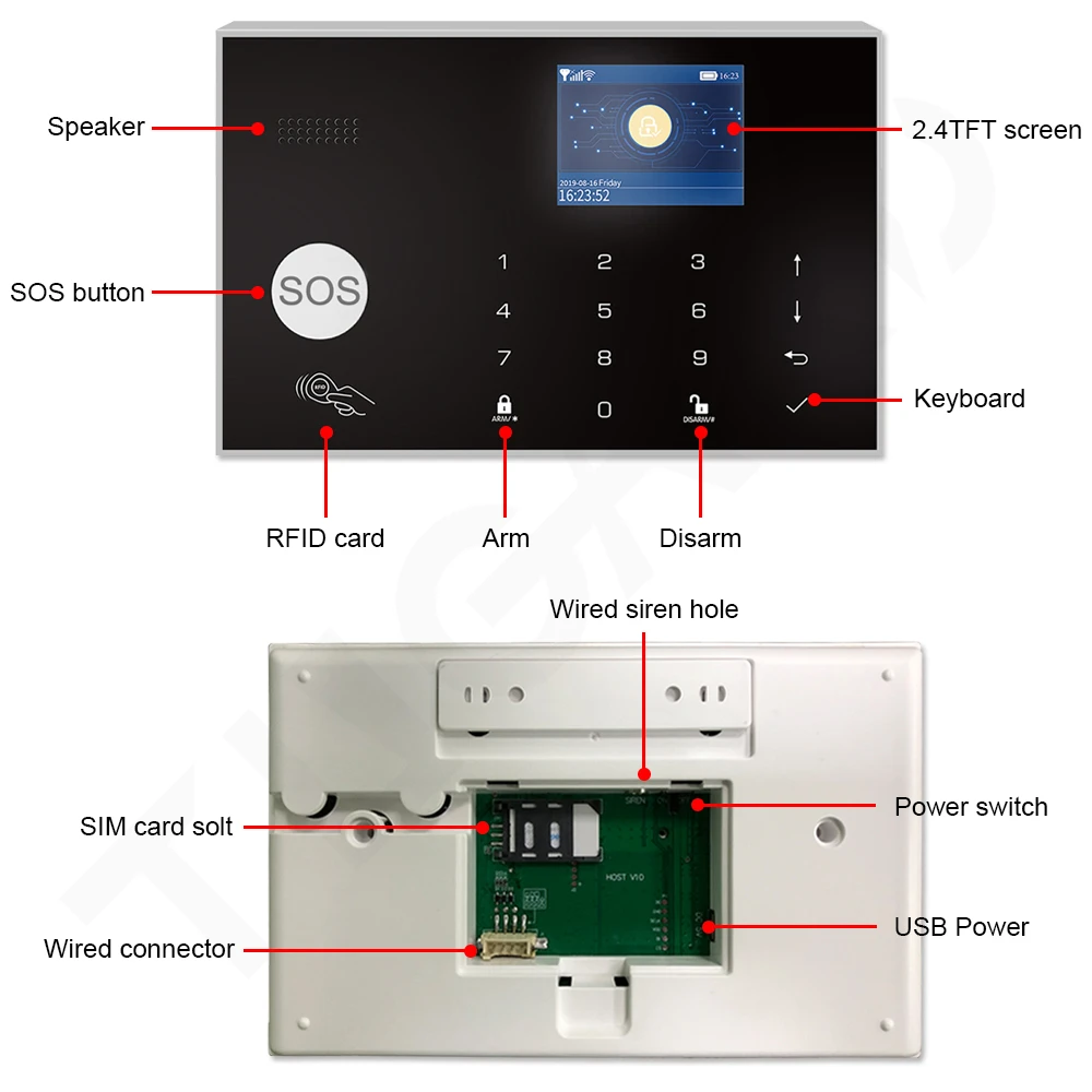* 3G & 4G + Wi-Fi сигнализация, поддерживает несколько каналов уведомления о тревоге, как приложение push/ SMS/голосовой телефонный звонок... * Функция синхронизации времени через сеть GSM/WiFi.