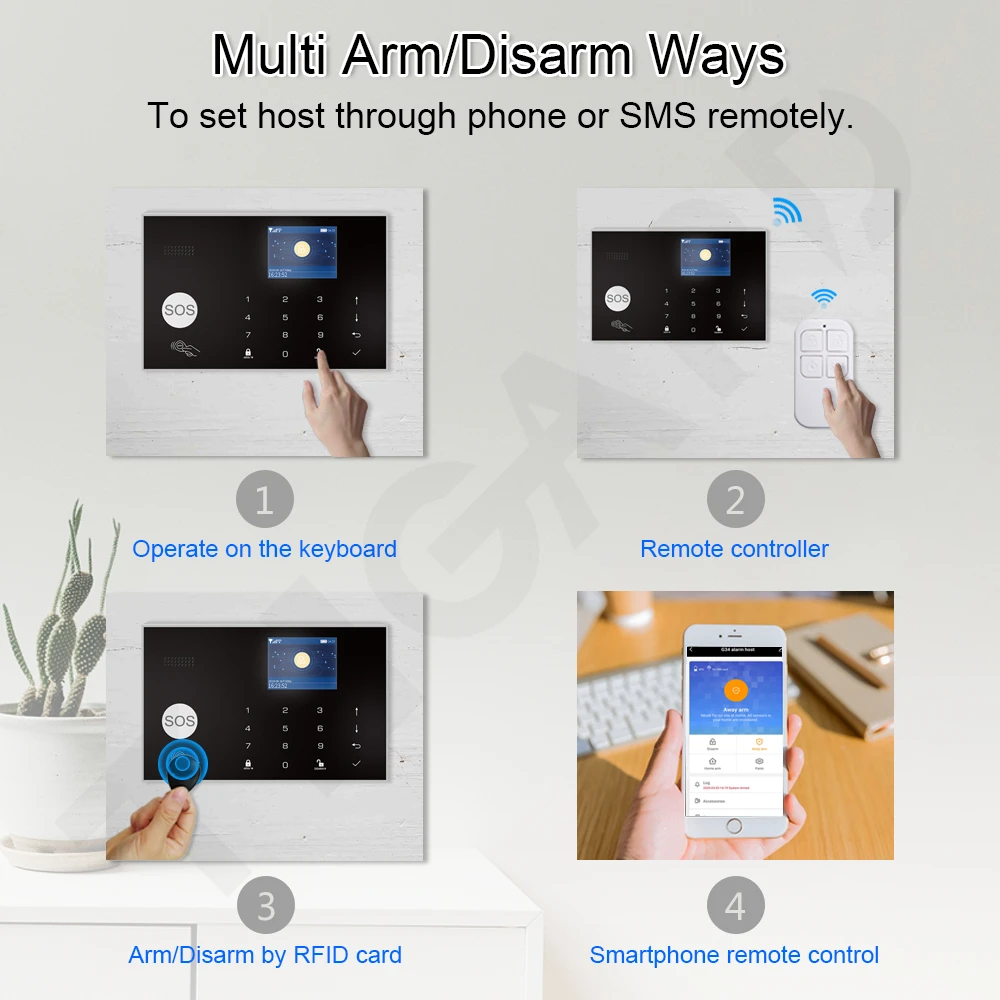 Система умного дома WiFi + GSM/3G/4G идеально подходит для вашей домашней безопасности. Когда двери/окна открываются/закрываются или при обнаружении движения, на месте раздается громкий тревожный сигнал SOS для предотвращения нежелательных незваных телефонных будильников отправка будильника SMS и уведомления приложения на заданный телефон номера.