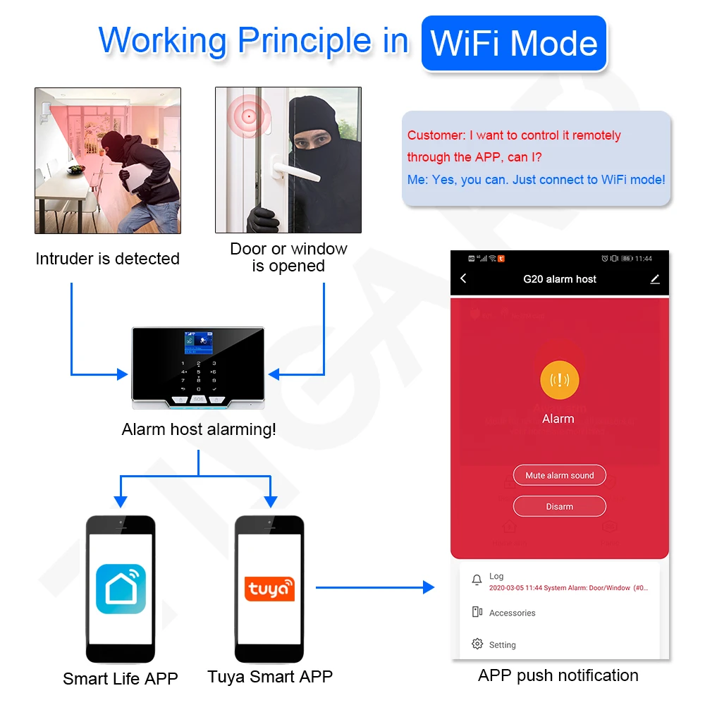 Приложение дистанционного управления, Wifi Бесплатные push-сообщения, более простой, более экономичный. * Хост будильника будет нажимать сигнал тревоги на ваш android или ios телефон через WIFI, когда кто-то сломается в вашем доме, в то же время звук сирены. * Вы также можете дистанционно управлять системой сигнализации через приложение Tuya Smart или приложение Smart Life.