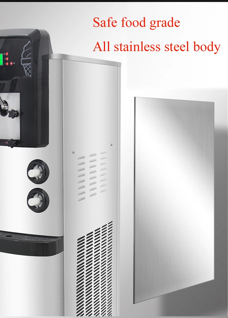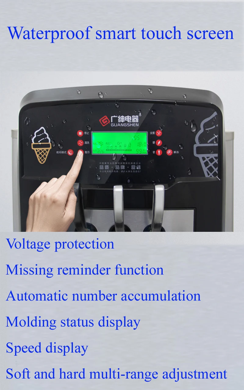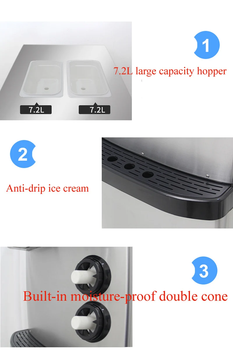 (1). Машина оснащена двумя компрессорами, и один из компрессоров имеет систему предварительного охлаждения резервуара смесителя самостоятельно. (2). Машина имеет функцию предварительной системы охлаждения, когда она не работает в ночное время, если нажмите кнопку «Ночной режим», машина начнет «Ночной режим» Включите ночной режим: машина войдет в систему охлаждения и сохранит свежесть, экономя затраты и экономя время. (3). Жидкий цилиндр мороженого имеет отметку клеща, его удобно наблюдать за оставшейся жидкостью. (4). 304 нержавеющая сталь Морозильный цилиндр, пищевой нейлон смеситель. (5). Машина более удобна, потому что у нее есть две полки для яиц.