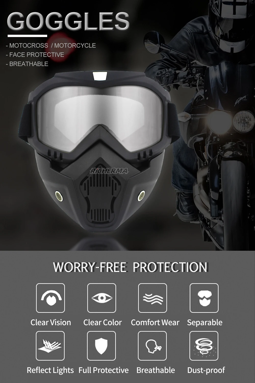 Особенности:Анти-блики анти-туман пыленепроницаемый с защитой от ветра