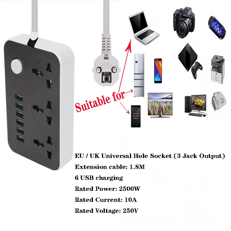 Несколько гнезд Технические данные: Номинальное напряжение: 250 В Номинальный ток: 10A Номинальная мощность: 2500 Вт Выход USB: 5 В, 1 А Выходной порт: 3 разъема + 3 usb-порта Длина кабеля: 1,8 м Размеры: 15 X 10X 3,5 см Размер упаковки (Д х Ш х В): Удлинительный Кабель 1,8 м Безопасно адаптироваться к различным устройствам для зарядки Модная удобная домашняя одежда, тонкая работа, простая Мода Стабильный выход заряжается быстрее Интерфейс пластиковой головки более прочный и не легко сломать Совместимость: подходит для различных мобильных телефонов, iphone,ipod,ipad, планшетных ПК, PDA,bluetoth гарнитуры и других цифровых продуктов.