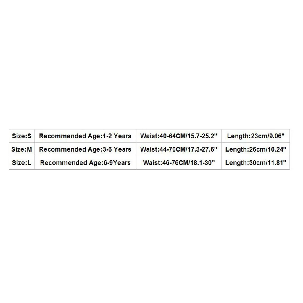 Размер Рекомендуемый возраст Талия Длина S 1-2 года 40-64 см/15,7-25,2" 23 см/9,06'' М 3-6 лет 44-70 см/17,3-27,6" 26 см/10,24'' L 6-9 лет 46-76 см/18,1-30" 30 см/11,81''