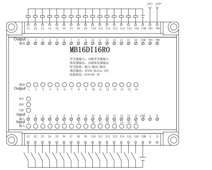 В MBSL16DI16RO модуль 16-канальный цифровой изолированный входной сигнал и 16-канальный реле изолированный выход модуль, который выводится через единичный RS485 интерфейсом.