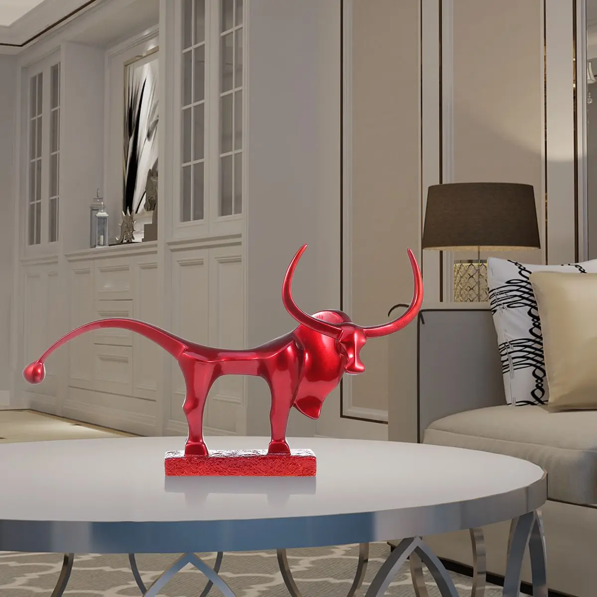Это современная скульптура крупного рогатого скота, изготовленная из смолы, которая имеет яркий цвет и блестящий внешний вид.