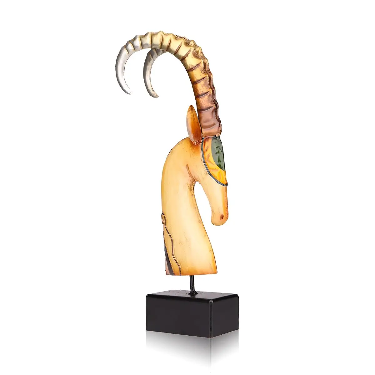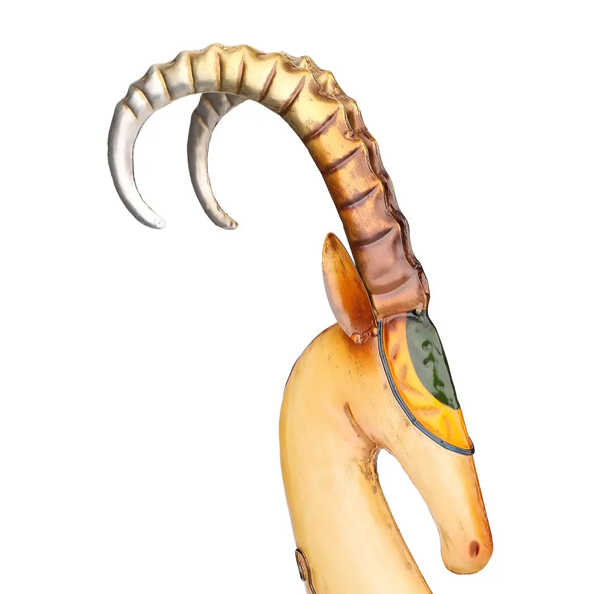 Это элегантная металлическая скульптура козы ручной работы, выполненная из железа. Изогнутая горловина показывает элегантную фигуру, а рожка преувеличенно поднимается вверх, а также классический цвет и лаконичную форму, в целом она полна чувства дизайна. Высококачественная Экологичная краска для выпечки, а также технология ручной печати, таким образом, продукт является нержавеющим и привлекательным. Очень подходит для украшения гостиной, спальни, офиса и кафе.