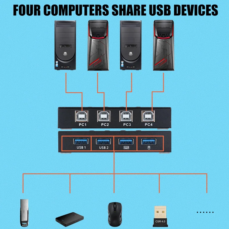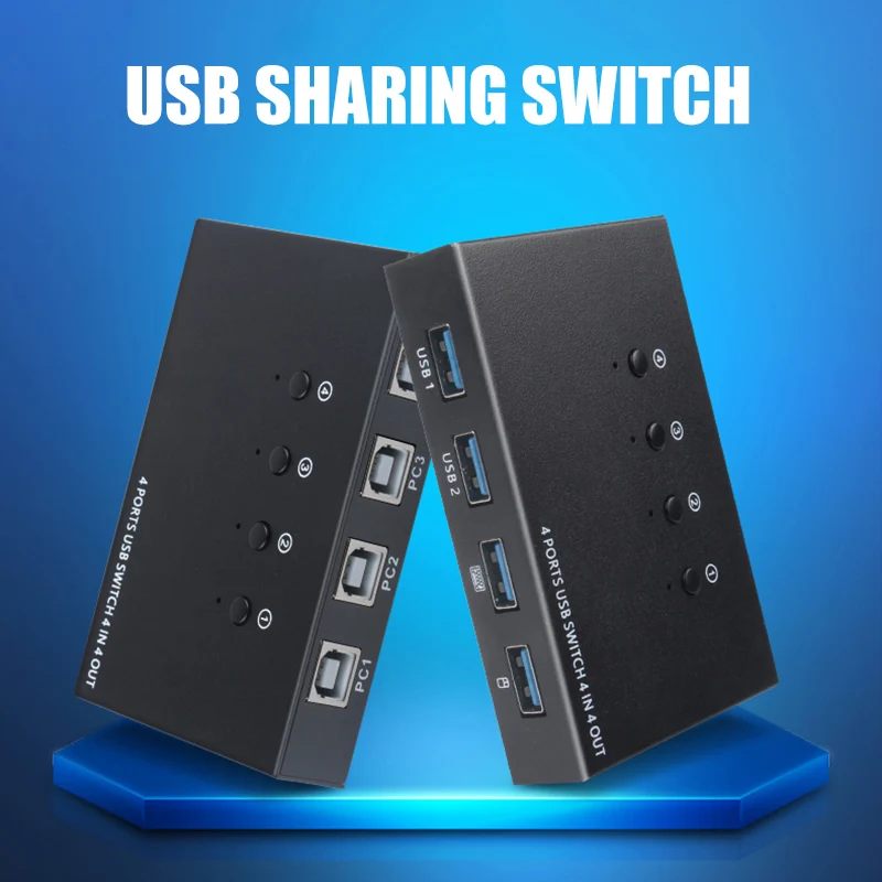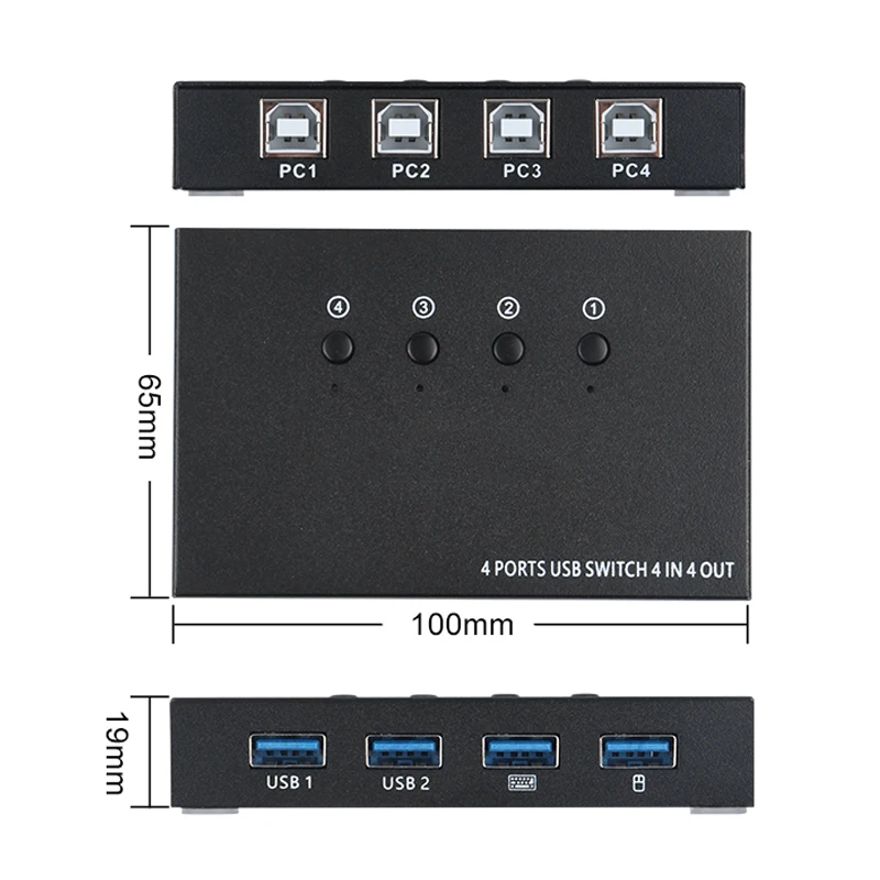 Функция продукта: для совместного использования usb-устройств, таких как usb-принтер, сканер, внешний накопитель или другое usb-устройство с четырьмя компьютерами (четыре компьютера используют один набор клавиатуры и мыши), И вы можете свободно переключаться между этими четырьмя компьютерами при подключении к usb-устройству одной кнопкой