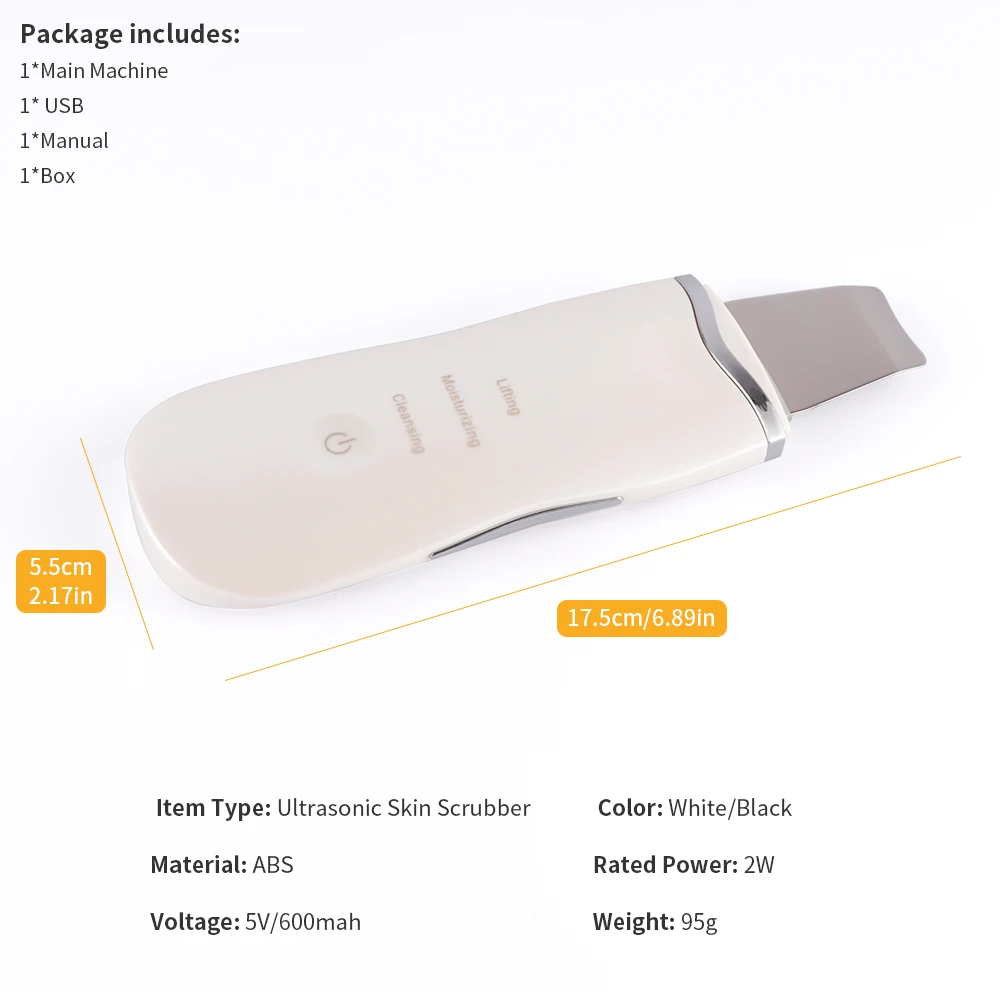 Тип товара: ультразвуковой скруббер для кожи Цвет: белый/черный Материал: АБС-пластик Номинальная мощность: 2 Вт Напряжение: 5 В/600 мАч Вес: 95 г, бесплатная доставка Размеры: 5,5*17,5 см/2,17 * 6.89in