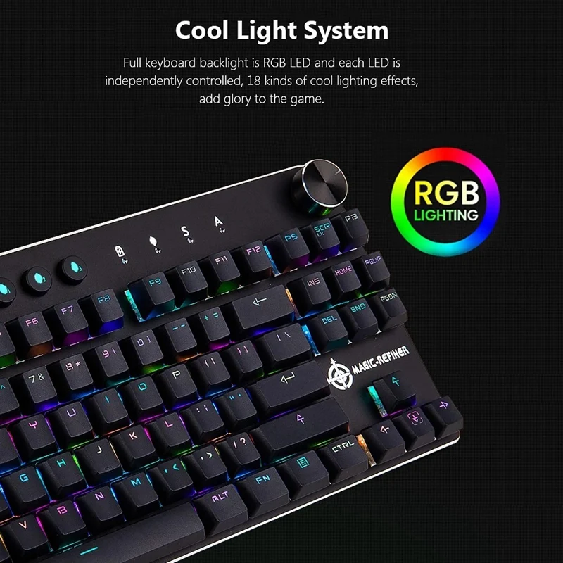 MAGIC-REFINER MK11-это 87 клавишная механическая клавиатура RGB, которая может быть подключена к проводу USB и может быть подключена к устройству BT. Кроме того, он также может подключать 3 BT устройства и может легко переключаться между 3 BT режимом. Он имеет RGB атмосферные огни на всей клавиатуре, что обеспечивает вам теплую работу и игровую среду.