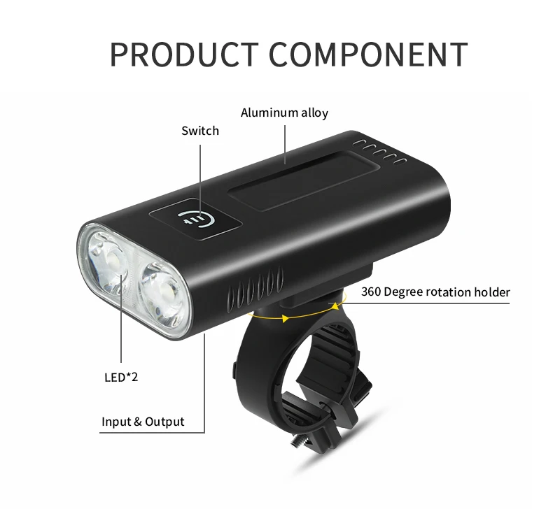 1. Улучшенный дизайн: USB Перезаряжаемый велосипедный светильник, Встроенный перезаряжаемый литиевый аккумулятор 18650. Яркий светодиодный T6/L2, более прочный. 2. Водонепроницаемость: IPX5 Водонепроницаемый, изготовлен из высококачественного алюминиевого сплава, защищен от брызг воды под любым углом. Лучший велосипедный светильник для мужчин, женщин и детей, которым нравится езда на велосипеде и занятия спортом на открытом воздухе 3. Простота установки: без необходимых инструментов, с вращающимся на 360 ° держателем, может сиять в буквальном порядке в любом направлении, которое вы хотите. 4. Различные режимы: высокая, неделя, мигание стробоскопа три режима, фара также имеет функцию фонарика, который может использоваться в различных сцен, таких как езда на велосипеде, кемпинг, ночная рыбалка, ходьба. 5. Внешний аккумулятор: лампа может использоваться как внешний аккумулятор, если ваш телефон не имеет питания во время езды, вы можете использовать его для зарядки телефона.