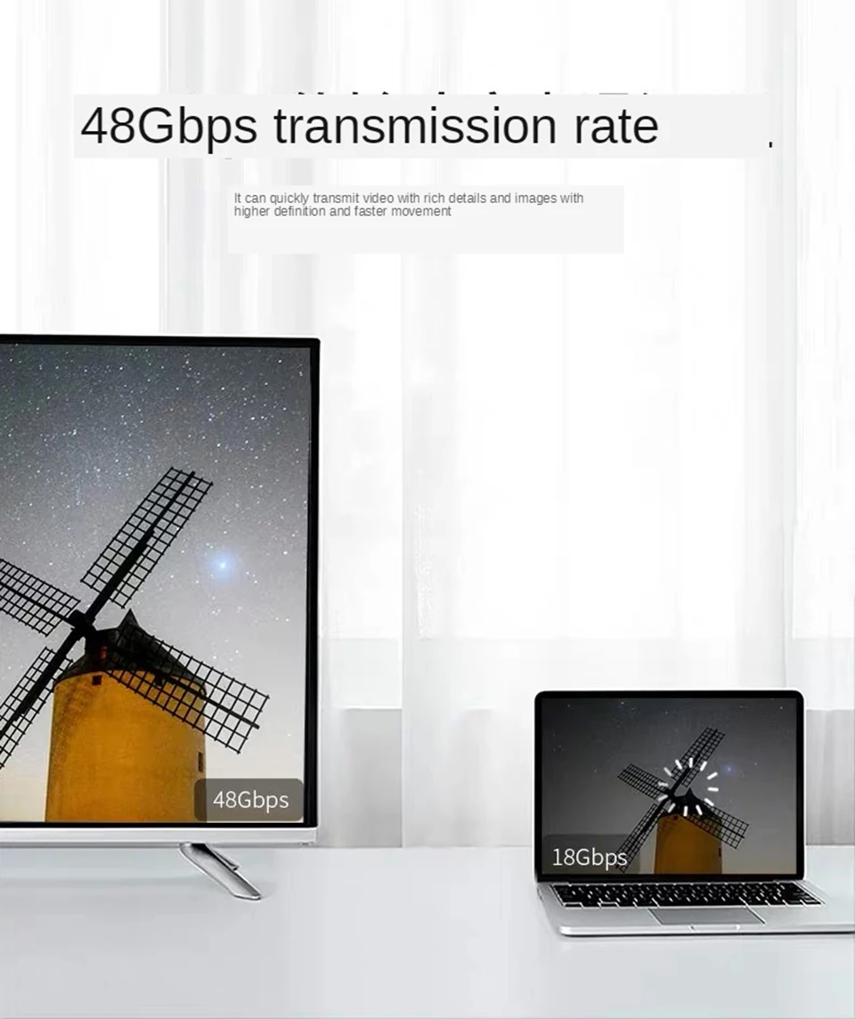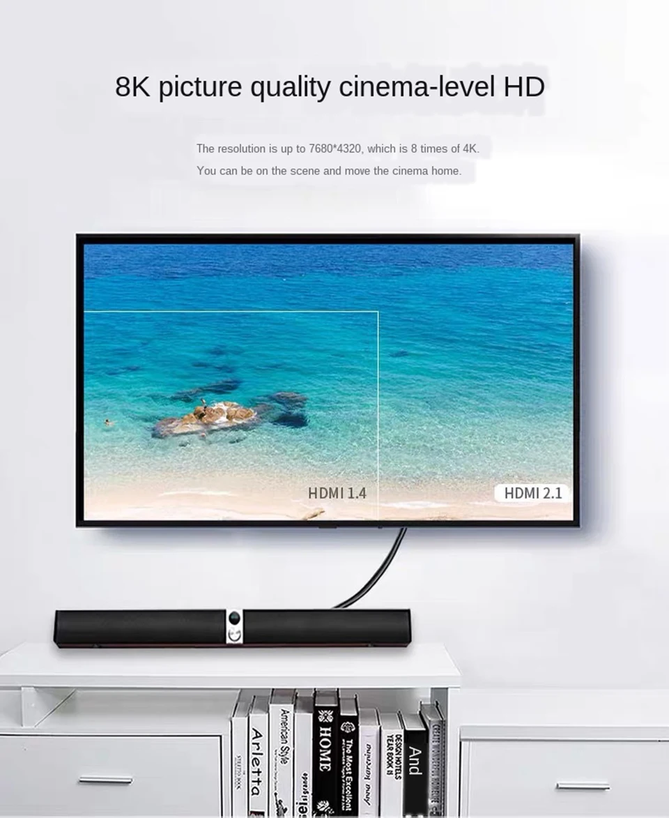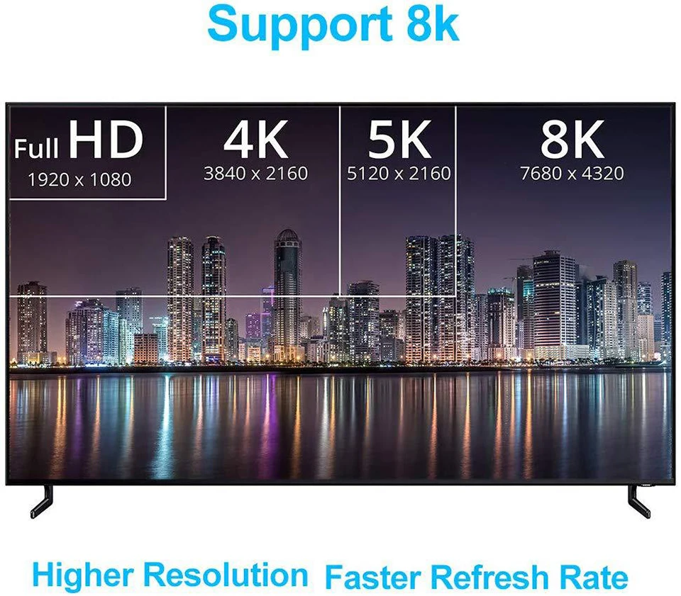 Последние характеристики HDMI поддерживают широкий диапазон более высоких разрешения видео, частоты обновления, включая 8K60 и 4K120, и разрешения до 10K. В то же время поддерживает динамический формат HDR, емкость полосы пропускания увеличена до 48G HDMI. Новый сверхвысокоскоростной кабель HDMI поддерживает полосу пропускания 48 Гбит/с. Кабель обеспечивает высокую полоса пропускания, независимые функции, включая несжатое видео 8K, которое поддерживает HDR. Ультранизкие EMI (электромагнитные помехи) могут уменьшить интерференцию для беспроводных устройств, прилегающих к сети. Кабель совместим с устройствами HDMI, также может использоваться с другими устройствами HDMI.