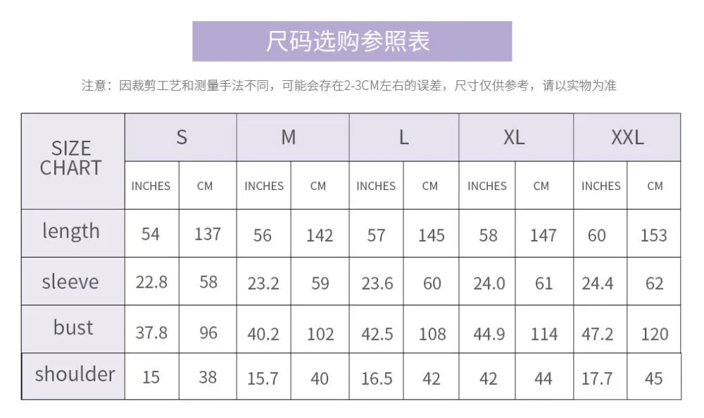 S: ширина плеч 38 см, обхват груди 96 см, рукав 59 см, длина 137 см M: Плечо 39 см, обхват груди 101 см, рукав 60 см, длина 142 см L: плечо 40 см, обхват груди 106 см, рукав 61 см, длина 145 см XL: ширина плеч 41 см, обхват груди 112 см, длина рукава 62 см, длина 147 см 2XL: ширина плеч 42 см, обхват груди 118 см, длина рукава 62 см, длина 153 см