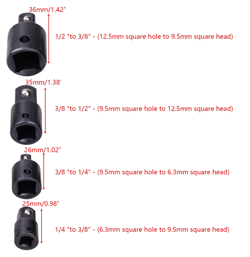 3/8 "до 1/2" - (9,5 мм квадратное отверстие для 12,5 мм квадратная головка) Длина: 35 мм (1,38 дюймов)