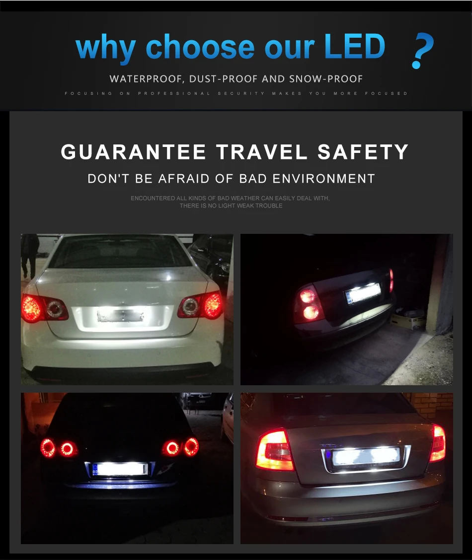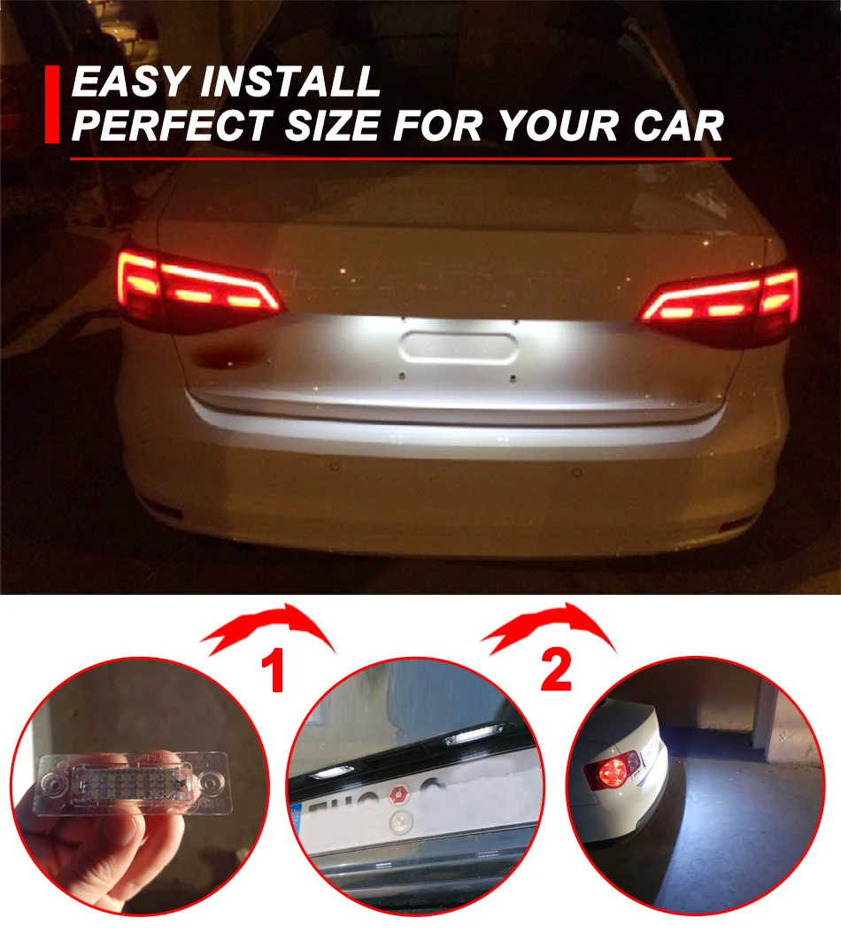 Технические характеристики: 100% Фирменная новинка. Светильник Цвет: белый. Напряжение: 12-30 в. Светильник Цвет: 6000K. Световой поток: 400LM Chipsets: 18 шт 3528 SMD. (Чип на плате) Срок службы: более 60000 часов. Посылка включает в себя: 2 x светодиодный номерного знака светильник Для модели ниже, пожалуйста, проверьте перед покупкой. Для VW Touran 2003-2010 Для VW Golf 2005-2009 Для VW Jetta 2005-2010 Для VW Caddy III 2004-2010 Для VW Passat Cimousint 2001-2005 Для VW Passat Combi/вариант 2006-2008 Для VW T5 Transporter 2003-2009 Для Skoda Super I 2002-2008