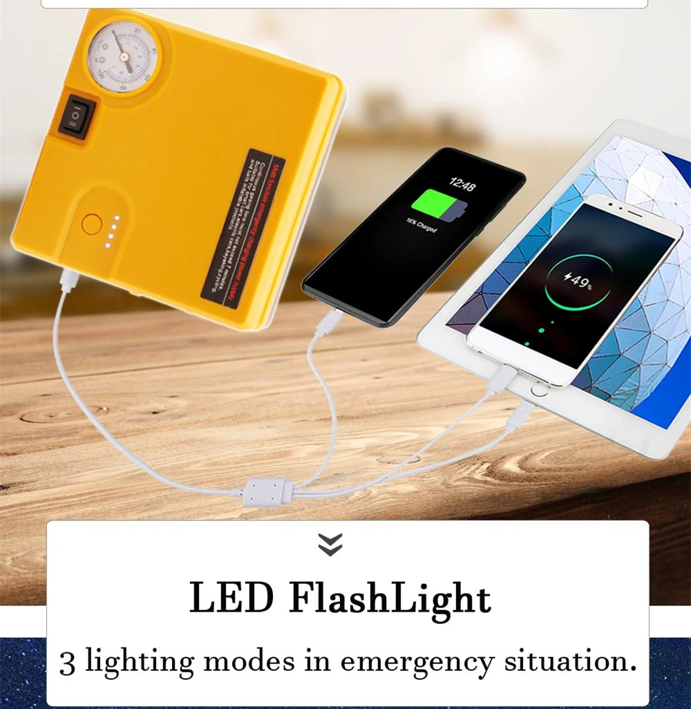 Для того чтобы пусковое устройство, 12V бензиновый автомобиль (до 5.0L) и дизельный автомобиль (до 3.0L) за считанные секунды в тех случаях, когда автомобиль аккумулятор мертвых Портативный воздушный компрессор; Надуть шины своевременно при чрезвычайной ситуации или другой ситуации; Многофункциональный внешний аккумулятор; Usb-порты 5 В/2 а для мобильных телефонов/планшетов/камер, зарядка одновременно; Освещение/Стробоскоп/SOS освещение, 3 режима освещения подходят для любой сцены на открытом воздухе; Освещение работает до 72 часов с одной полной перезарядкой, хороший помощник во время путешествия; Лучший подарок для вашего отца, братьев, мужа, друзей и себя; Лучший партнер для вашего автомобиля.