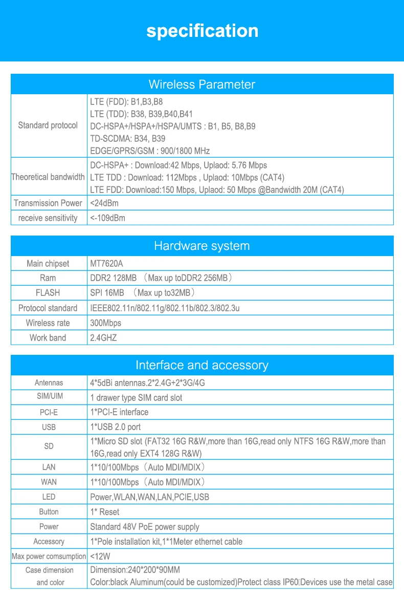 Просто описание использует новейшие беспроводные решения, производительность лучше и больше функций. Стабильный беспроводной сигнал, более сильная масштабируемость. 2,4 ГГц до 300 Мбит/с. Также поддерживает 3G,4G (3G,4G модуль PCIE необходим),