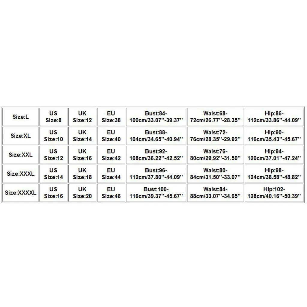 Размеры Нам Размеры UK Размеры ЕС Размеры Обхват груди Обхват талии Обхват бедер L 8 12 38 84-100 см/33,07 ''-39,37'' 68-72 см/26,77 ''-28,35'' 86-112 см/33,86 ''-44,09'' XL 10 14 40 88-104 см/34,65 ''-40,94'' 72-76 см/28,35 ''-29,92'' 90-116 см/35,43 ''-45,67'' XXL 12 16 42 92-108 см/36,22 ''-42,52'' 76-80 см/29,92 ''-31,50'' 94-120 см/37,01 ''-47,24'' XХХL 14 18 44 96-112 см/37,80 ''-44,09'' 80-84 см/31,50 ''-33,07'' 98-124 см/38,58 ''-48,82'' XXXXL 16 20 46 100-116 см/39,37 ''-45,67'' 84-88 см/33,07 ''-34,65'' 102-128 см/40,16 ''-50,39''