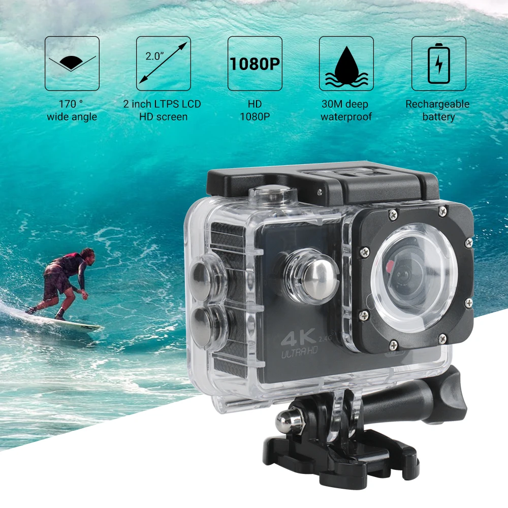 * 4K Ультра HD экшн-камера. Профессиональное видео 4K 30Fps и фотографии до 30 кадров в секунду для невероятных фотографий, что в 4 раза превышает разрешение традиционных HD камер. * Беспроводная Спортивная камера с пультом дистанционного управления. С пультом дистанционного управления 2,4G вы можете запечатлеть мир совершенно новым способом. Управление камерой, кадрирование снимков или Запись видео удобно. * Более длительный срок службы батареи. Экшн-камера H9 поставляется с перезаряжаемой батареей емкостью 900 мАч. Время записи 1080P 75 минут. Больше не беспокойтесь о времени записи этой экшн-камеры. * Встроенный Wi-Fi, просто загрузите приложение (GoPlus Cam) на свой телефон или планшет и Подключитесь к этой экшн-камере. Wi-Fi сигнал колеблется до 10 метров. * 30 м водонепроницаемая камера. H9 предназначен для защиты от экстремальных условий, а также прочный водонепроницаемый чехол. С аксессуарами, преобразует его для использования в помещении и на открытом воздухе.