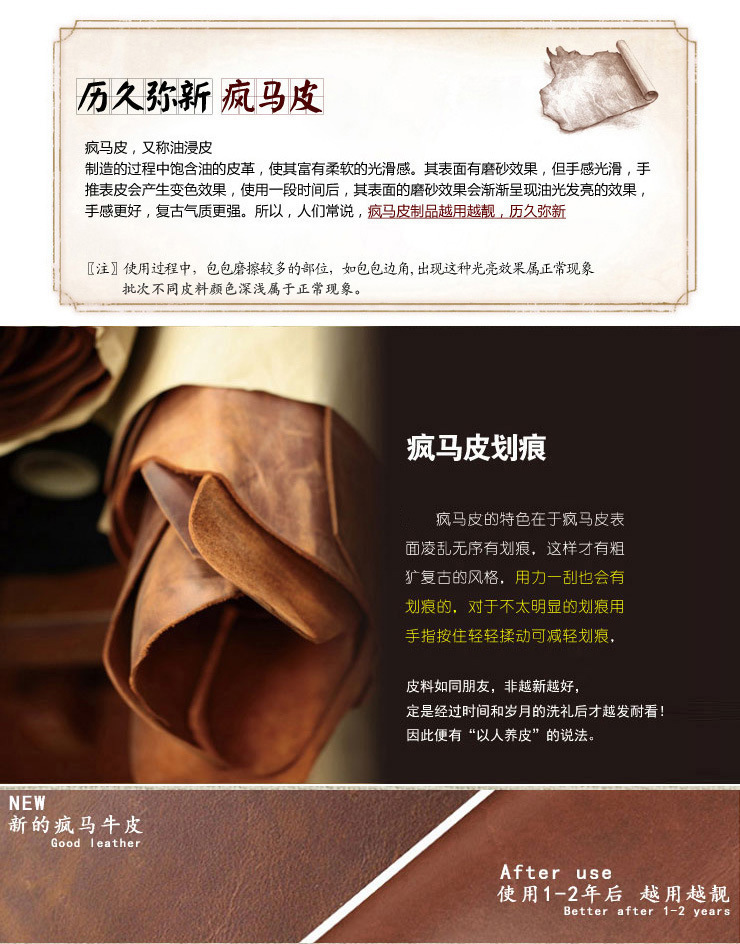Crazy Horse-это ремесло из воловьей кожи,Его характеристика заключается в том, что поверхность кожи Crazy Horse грязная и есть царапиныТаким образом, будет Ретро стиль грубой руды, потому что слой масляного воска прикреплен к поверхности, и будут следы, когда он будет соскабливаться силой, И незаметные царапины могут быть устранены трением руки, Или используйте метод нагрева, чтобы масло сползало и восстановилось после трения, или используйте крем для рук. Пожалуйста, не размещайте заказ, если это неприемлемо.