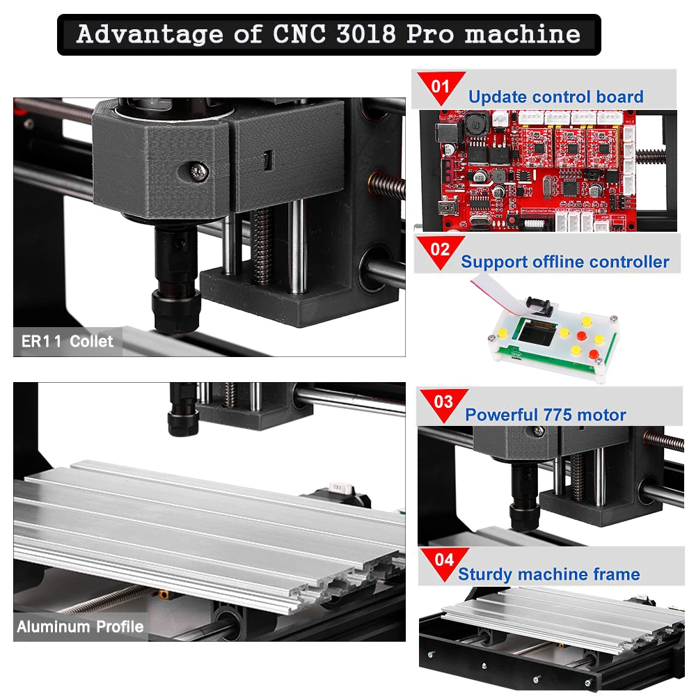CNC 3018-Pro-это обновленная версия CNC 3018, по сравнению со старой моделью, с автономным контроллером, может быть скульптурой в автономном состоянии.