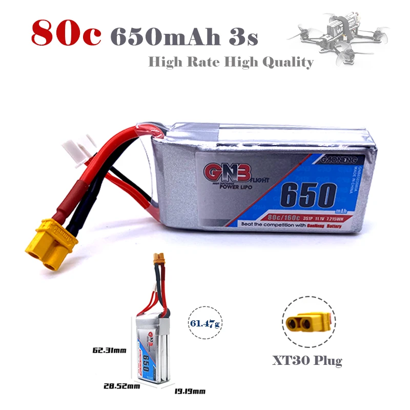 ● Параметры батареи: Gaoneng GNB 11,1 V 650mAh 80C/160C 3S ● Емкость: 650 мАч ● Размер: 62,3*28,62*19,19 мм ● Скорость непрерывного разряда: 80C/160C ● Вес: около 61,47 г ● Разъем: XT30 JST или другие