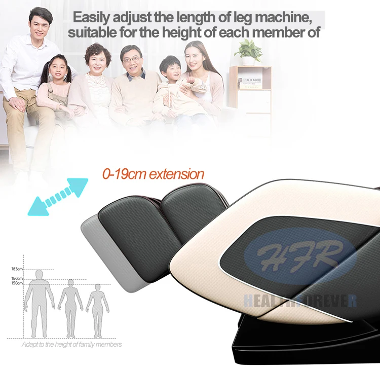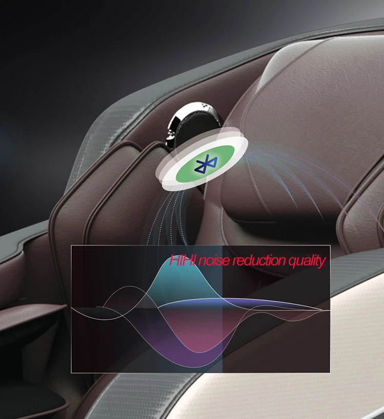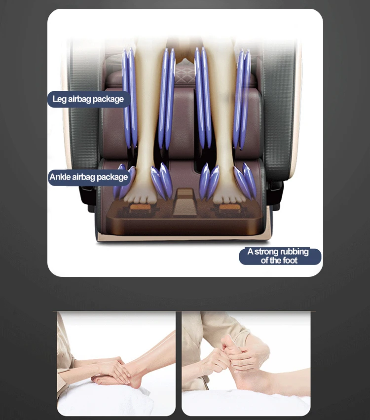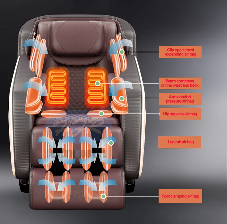 1.S-L тип кривой для массажа суставов человеческого тела; 2. Спинка С четырехколесным массажным механизмом; 3. Выдвижная подставка для ног максимум 20 см; 4. Весь стул с 6 двигателями водителя, 1 воздушный насос, 8 магнитных клапанов, 26 подушек безопасности; 5. Давление подушки безопасности для головы, плеч, ягодиц, рук, икр и ног; 6. Нагревание для талии и ягодиц; 7. Функция автоматического определения высоты; 8. Роликовый массаж для подошвы (разработан с 6 роликами); 9. Пульт дистанционного управления с tft-экраном; 10. Функции воспроизведения музыки по Bluetooth; 11. Функция нулевой гравитации, параллельная функция перемещения одной кнопкой.