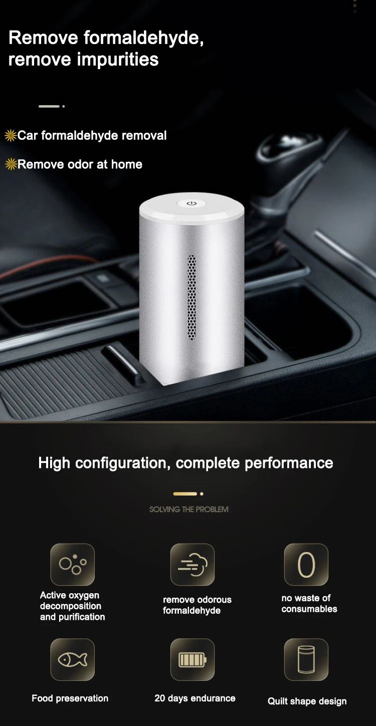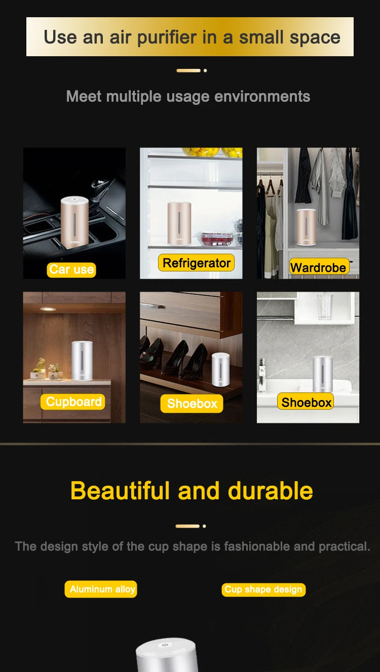Анион дезинфекция автомобиля бытовой дезинфекция холодильник дезинфекция очиститель воздуха 1. Подходит для: небольших помещений, таких как автомобили, холодильники, спальни, шкафы, обувные шкафы, книжные шкафы и т. д. 2. Встроенный источник питания батареи, зарядка в течение двух часов может длиться в течение двух недель 3. Водонепроницаемый дизайн, Рабочая температура: 10 ℃ -65 ℃ (не может быть помещен в морозильник) 4. Нет необходимости заменять расходные материалы, без добавок, 9 миллионов отрицательных ионных генераторов, 99% коэффициент стерилизации, более здоровый 5. Корпус из алюминиевого сплава (с использованием процесса анодирования), 9 миллионов отрицательных ионных генераторов, вход Micro USB, двойной USB Расширенный выходной интерфейс. Есть две модели и три цвета (золото, серебро, розовое золото) на выбор. Одна модель является перезаряжаемой моделью, а другая модель должна быть подключена к источнику питания, прежде чем ее можно использовать. Вы можете использовать дом автомобиля 12V и usb-порт кабеля телефона Android.