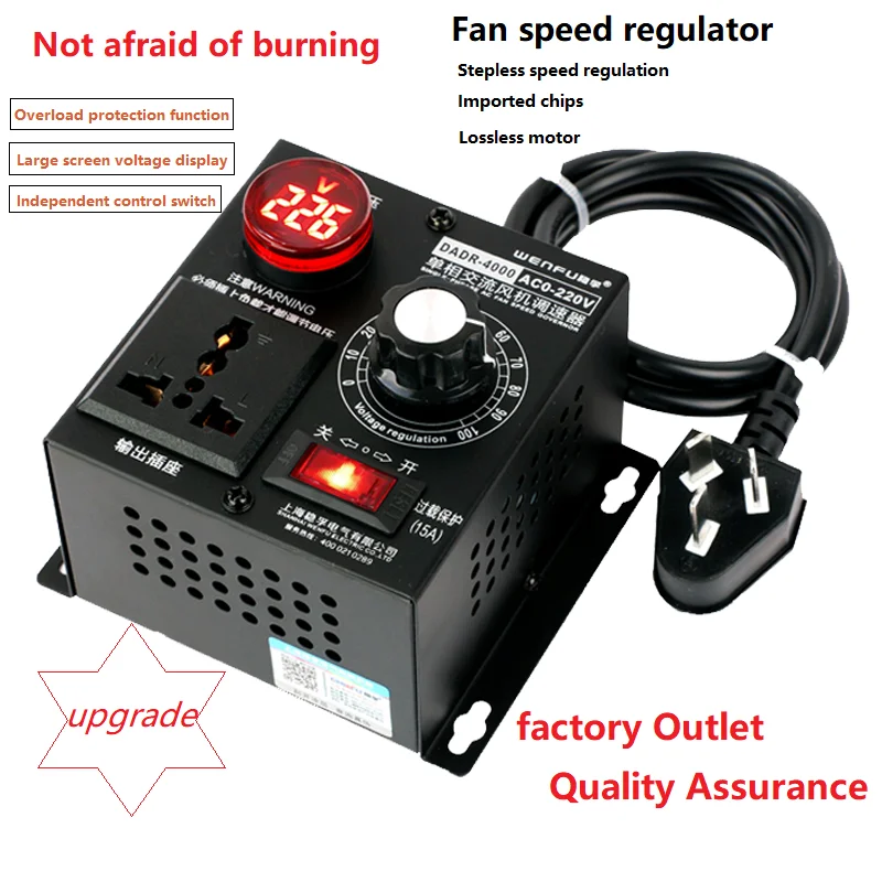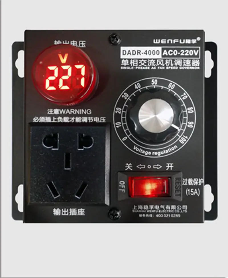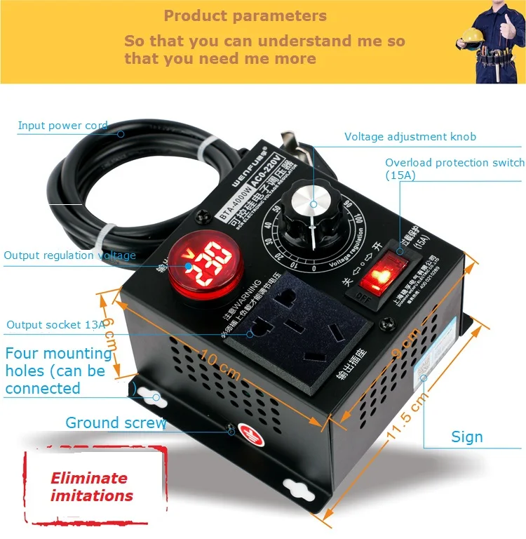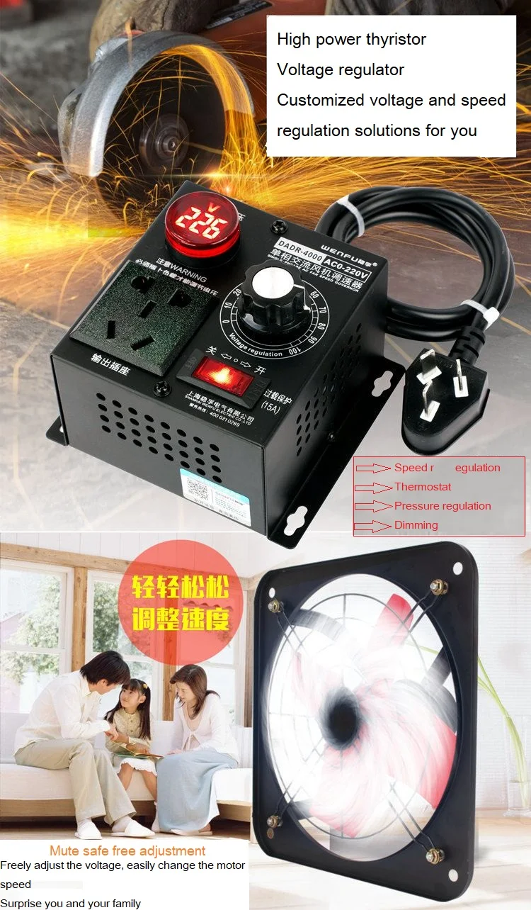 Product model: DRDA-4000W Input voltage: AC220V Output voltage: 0-220V adjustable (the voltmeter does not work when the output voltage is lower than 5V) Limit power: 4000W (suitable for 1000W-2000W motor load) Voltage regulation range: 0-220V steplessly adjustable (under load) step-down to 0V, boost from 10V Rated current: 9A Limit current: 18A Product features: Zero lag, zero delay, with peak voltage absorption circuit to effectively protect high-power thyristor against surge, spike, RC absorption multiple protection SCR model: STMicroelectronics Thyristor, BTA41-600B / 800B