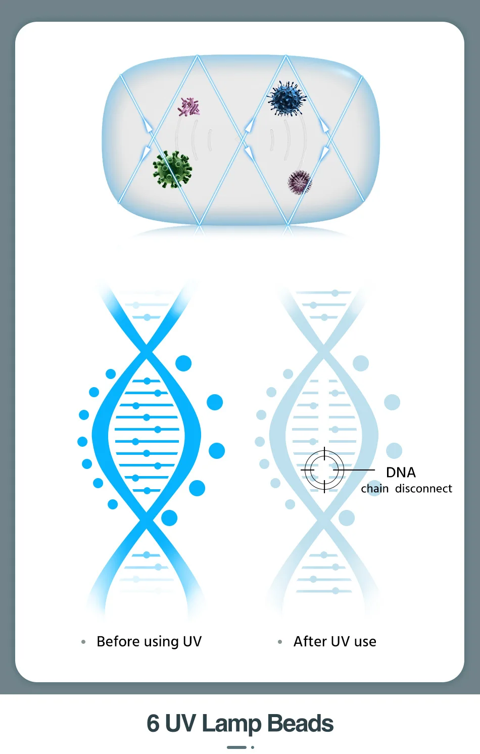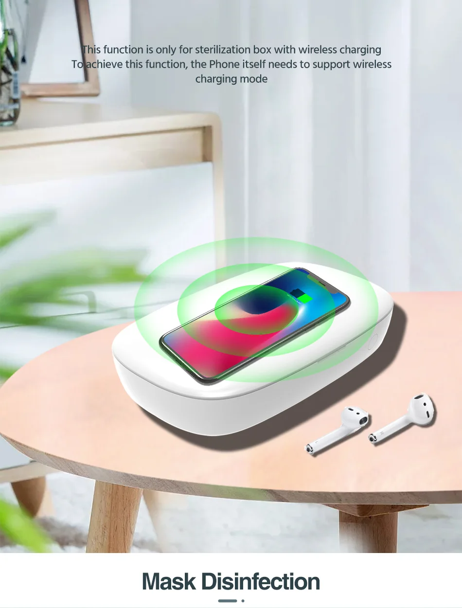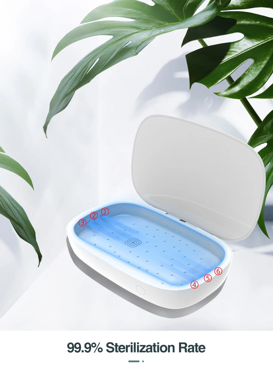 Уфл дезинфицирование! * Плюс функция беспроводной быстрой зарядки * Размер упаковочной коробки: 228*152*50 мм * Использование: маски, мобильные телефоны, аксессуары, инструменты для ногтей, очки, ключи, личная одежда и т. д. можно стерилизовать. Технические характеристики: * Спецификация: АБС-пластик * Напряжение: 5V2A * Номинальная мощность: 9 Вт * Источник питания: USB * Ультрафиолетовая полоса: UVC * УФ-лампа: 6 * УФ-Мощность: 3 Вт * Ультрафиолетовая Длина волны: 270-280нм