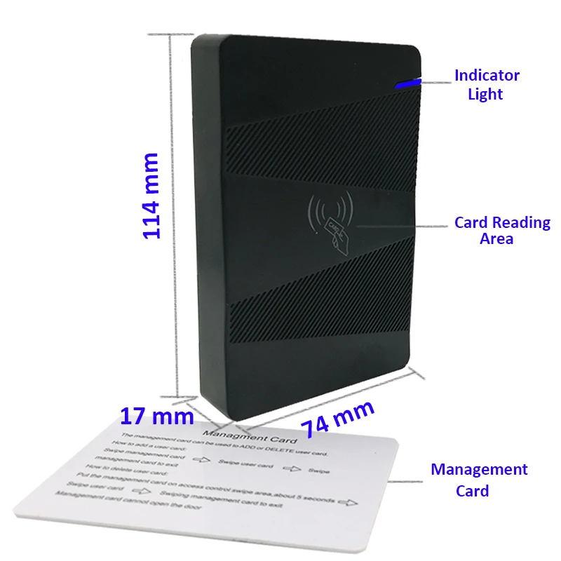 Рабочее напряжение: 12 В постоянного тока Рабочий ток: ≤ 100 мА Память: 15000 стандартных пользователей Клавиатура: без клавиатуры Расстояние считывания карты: 1-15 см Тип RF: EM-карта 125 кГц Рабочая температура:-~ 60 C Рабочая емкость: от 20% до 80% Вход Wiegand Открытая карта только Размеры изделия: 114*74*17 мм