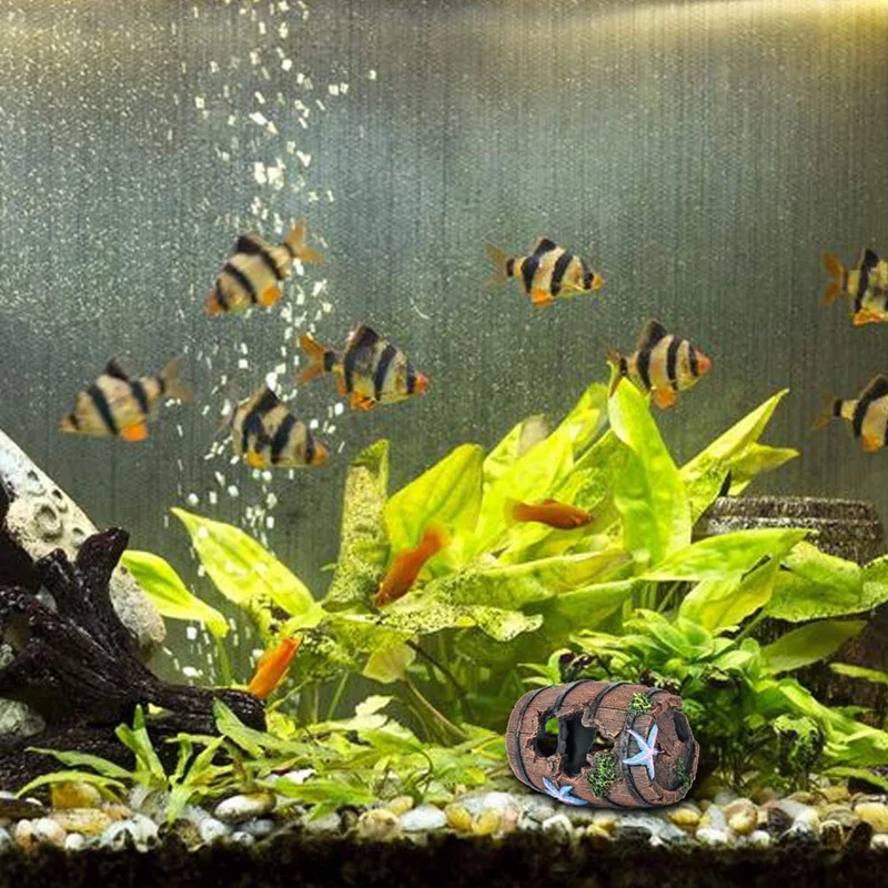 Decorative barrel serves as a nod to real underwater scenes, providing both a sense of terrain for the viewer and shelter for the fish.